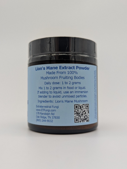 Extraterrestrial Fungi's popular organic Lion's Mane Extract Powder makes it easy to mix with your coffee or smoothie. Each capful contains 1000mg of pure Lion’s Mane fruiting body.